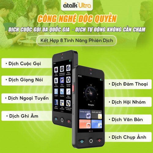 Bên cạnh đó, ATalk Ultra còn được trang bị khả năng dịch độc quyền "Tự Động Dịch - Không Cần Bấm Nút - Không Cần Chạm", mang lại trải nghiệm sử dụng tiện lợi, tối giản thao tác nhưng vẫn đảm bảo tốc độ và độ chính xác cao. Hãy cùng MayPhienDichVN khám phá chi tiết những tính năng nổi bật của máy phiên dịch ATalk Ultra ngay dưới đây.